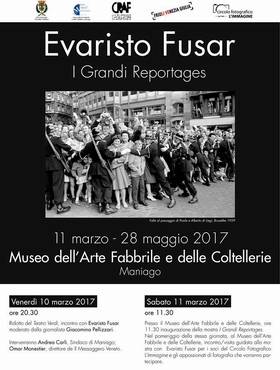 Mostra Evaristo Fusar: i grandi reportages fino al 28 maggio 2017 a Maniago, Museo dell’arte fabbrile e delle coltellerie. Evaristo Fusar ha raccontato cinquant’anni di vita e di storia. Ha immortalato grandi star, personaggi della politica e del jet set, miti del cinema. Ha realizzato grandi reportages fotografici lavorando accanto a giornalisti del calibro di Enzo Biagi. Continua la lettura di Mostra Evaristo Fusar: i grandi reportages a Maniago